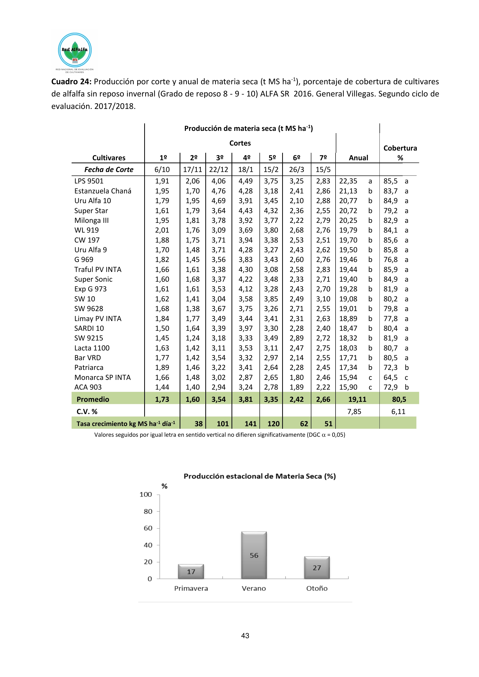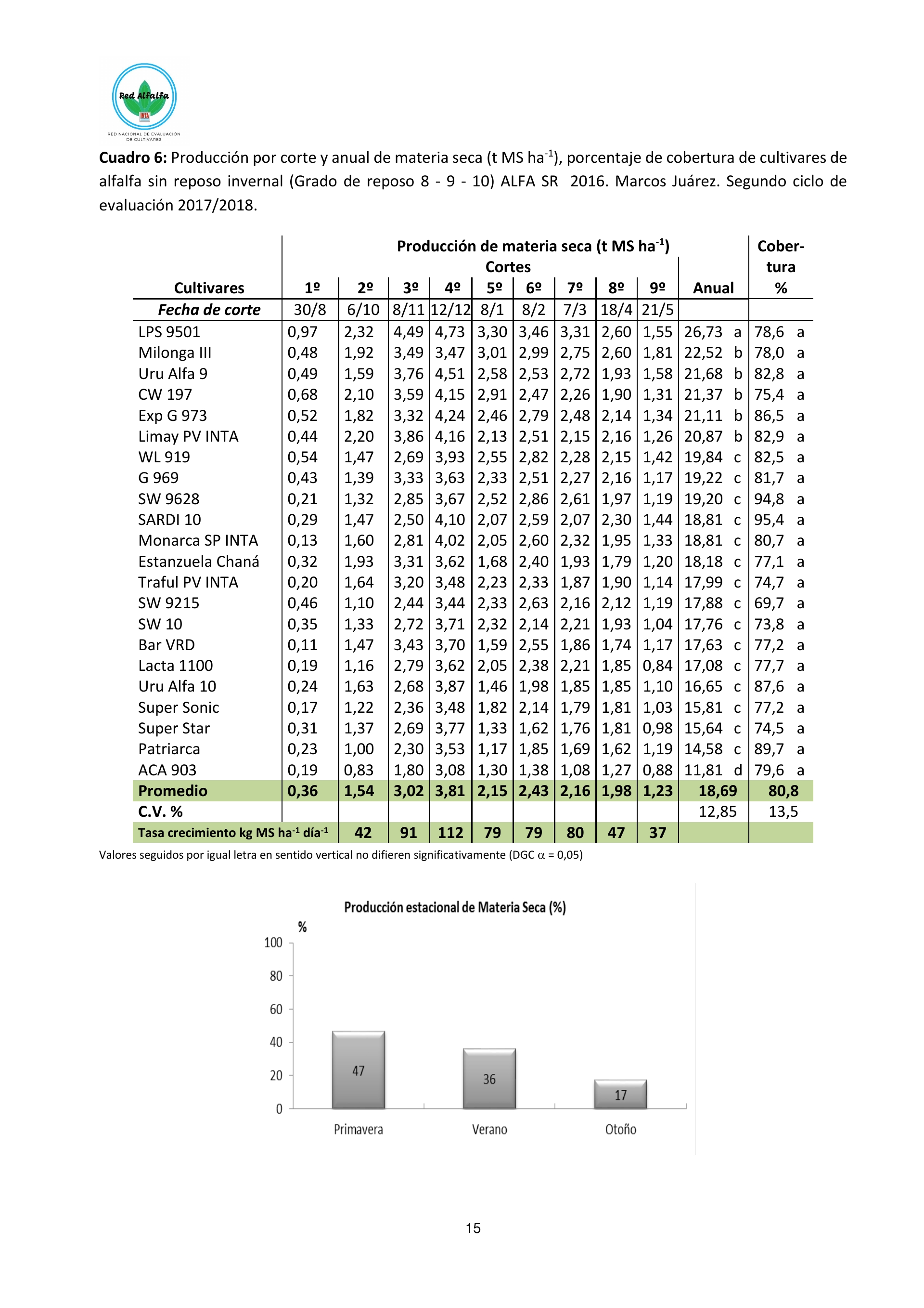 Tanto en INTA Marcos Juárez (Córdoba) como en INTA Gral. Villegas, la alfalfa LPS 9501 fue la mejor en producción por corte y anual de materia seca (t MS ha-1), porcentaje de cobertura de cultivares de alfalfa sin reposo invernal (latencia 8, 9 y 10).