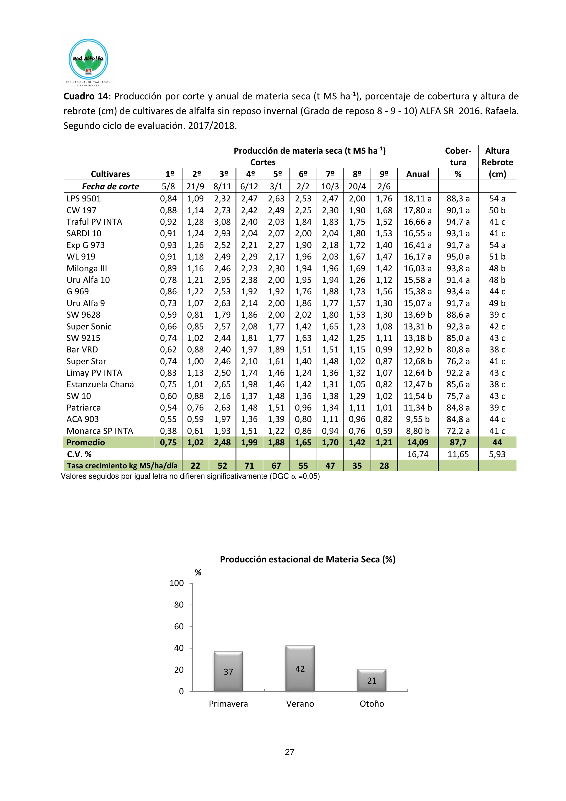 Por otro lado, en INTA Rafaela (Santa Fe), lideró el ranking que evaluaba la producción por corte y anual de materia seca (t MS ha-1), porcentaje de cobertura y altura de rebrote (cm) de cultivares sin reposo invernal (latencia 8, 9, 10).